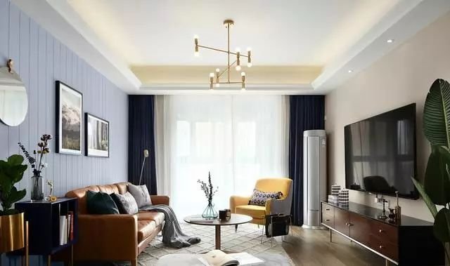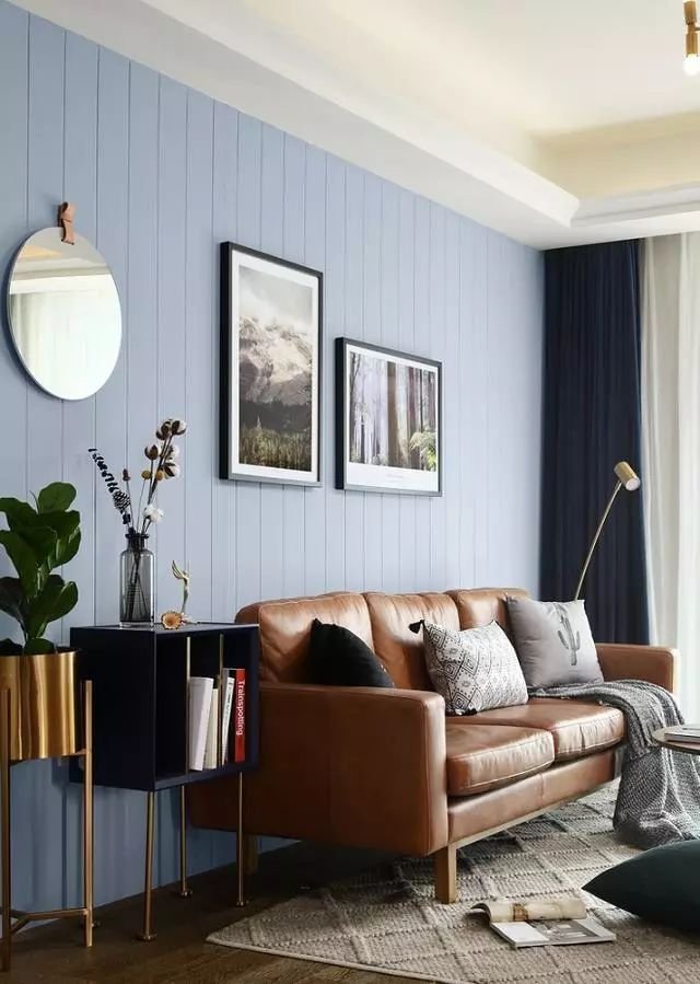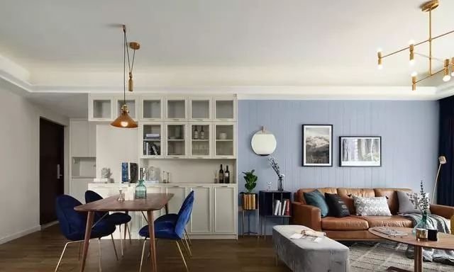 沙发墙装了蓝色护墙板,很清爽的颜色,皮质沙发增加质感,柠檬黄边椅让空间更活泼。