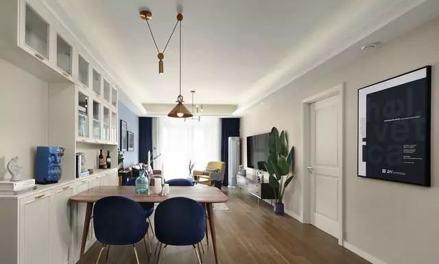 客厅、餐厅无隔断,餐厅的墙面做了一整面墙收纳柜,每个格子都装上玻璃门,东西放置一目了然,也不担心容易积灰。