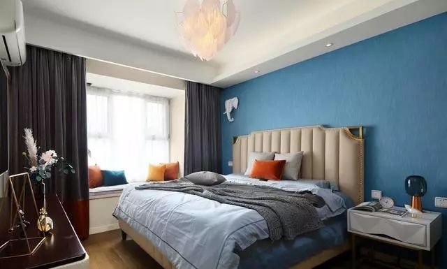 主卧贴了蓝色的壁纸,整个空间更显静谧。