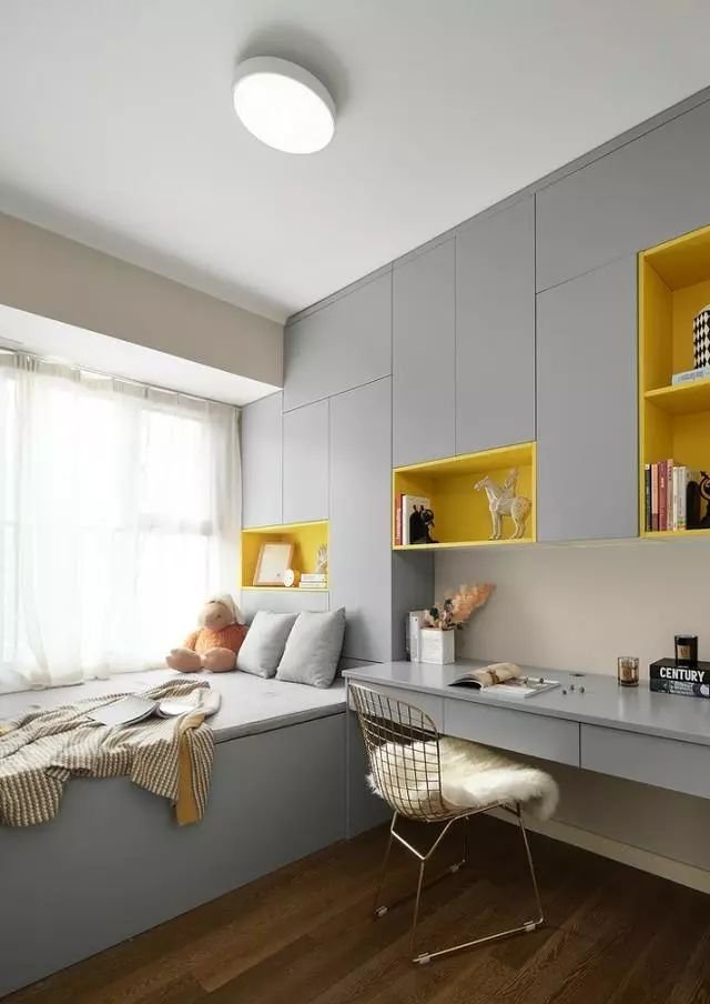 榻榻米连柜设计很实用,灰色和柠檬黄的搭配时尚又气质!