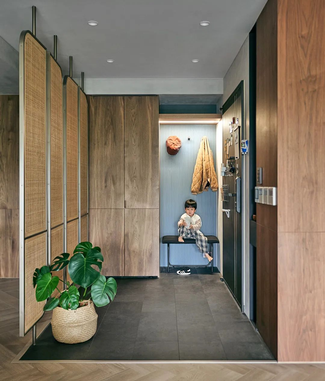 户型开门即餐厅,为了保持一定的私密性,避免“一览无余”,特意在玄关柜一侧设置了4面竹制格栅,隔断颜色与全屋的黑胡桃色系搭配起来也异常和谐。