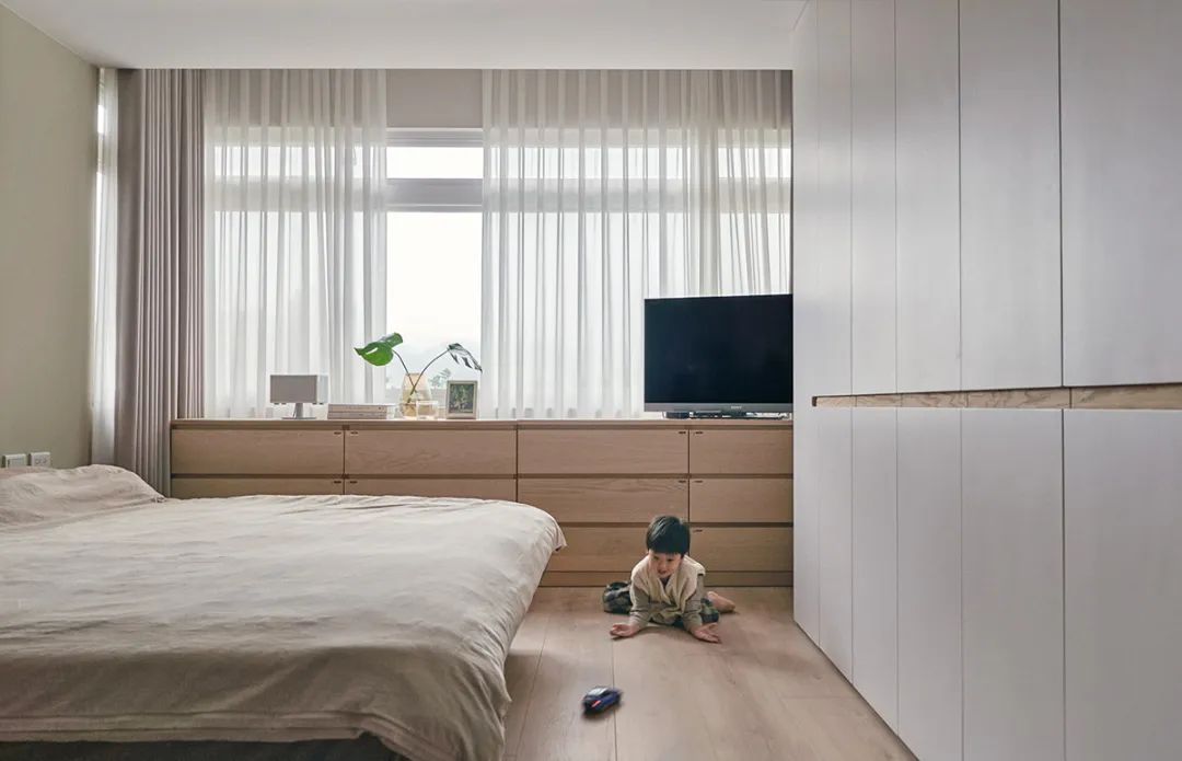 主卧保留屋主原有的浅色五斗柜,配上纯白色衣柜,营造一种干净清新的入睡环境。