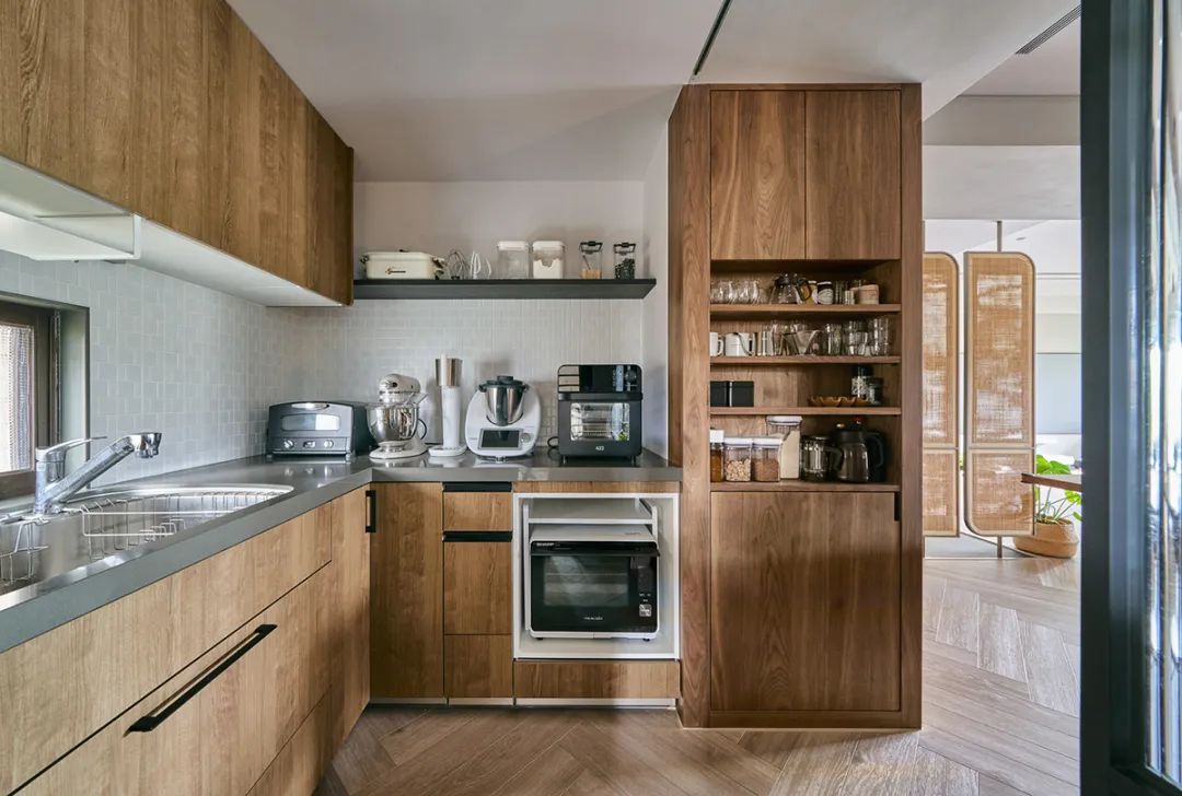 岛台向内延伸,以长虹玻璃为界,以内就是中厨区。L型橱柜+高柜的组合,不仅收纳力满分,日常下厨动线也很流畅自然。