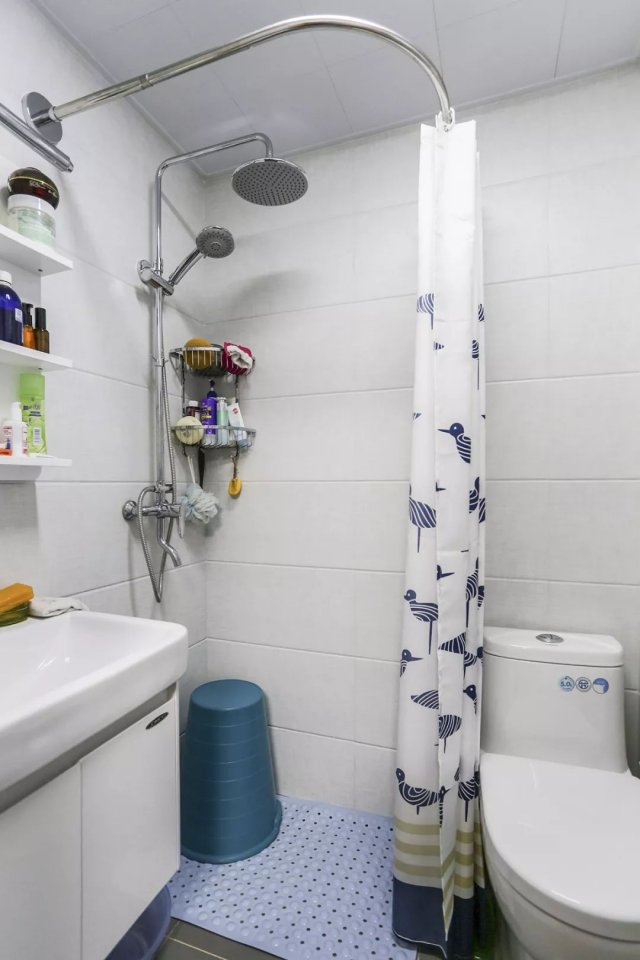 这时,可以换个思路,用浴帘挡住浴室柜和马桶,而不是把自己围起来。