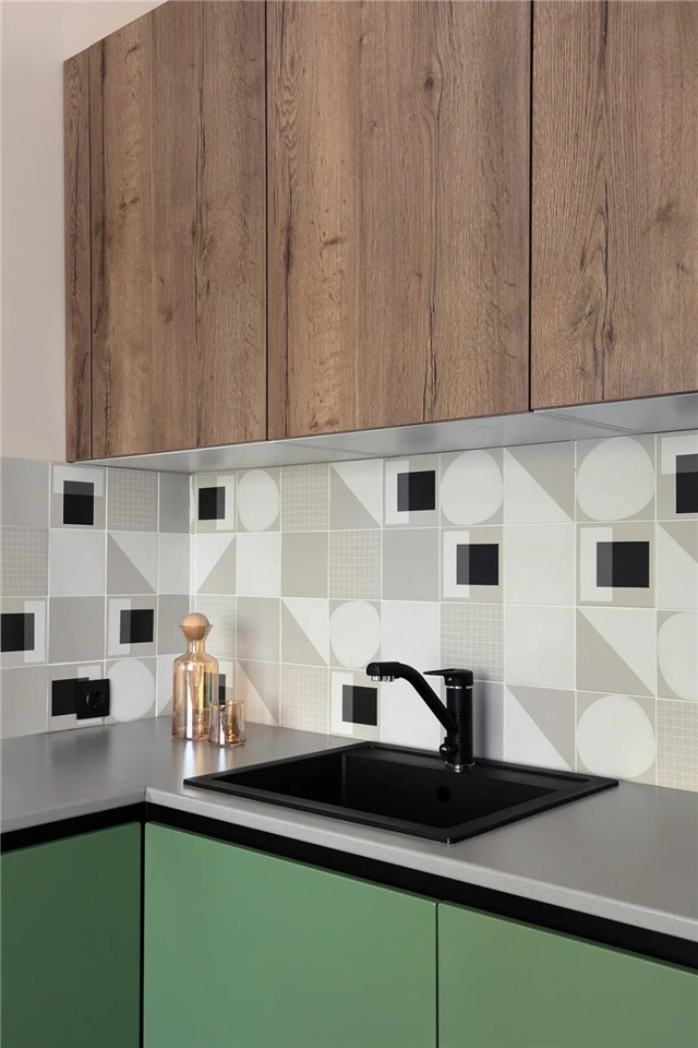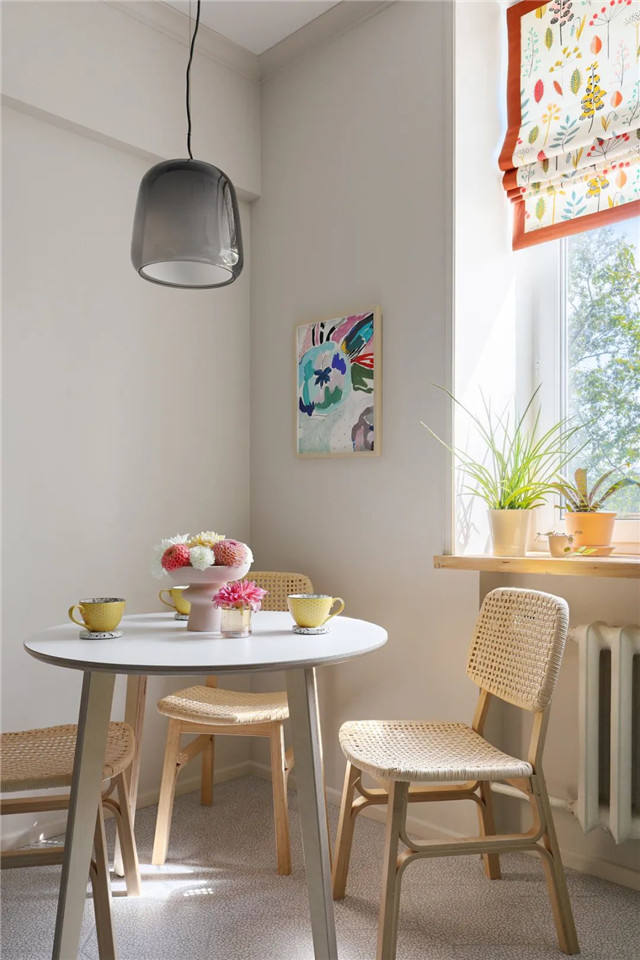 而厨房则采用了绿色橱柜和温馨阳光的用餐区
