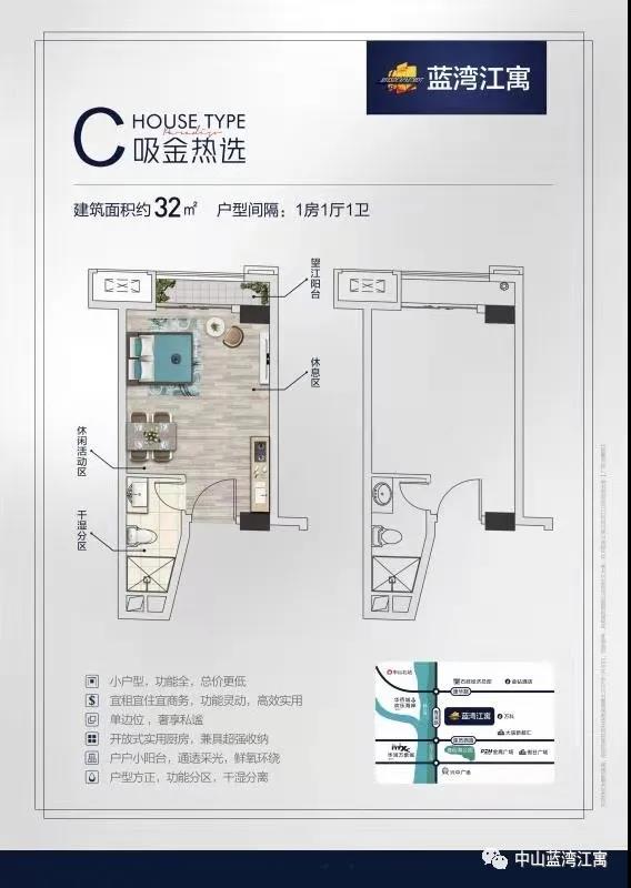 中山蓝湾江寓建面约32m2—43m2临江铂金奢寓,现楼发售,明火厨房,江景阳台,拎包即住,自由空间组合,宜居宜商宜投资。投资达人,创富必备!