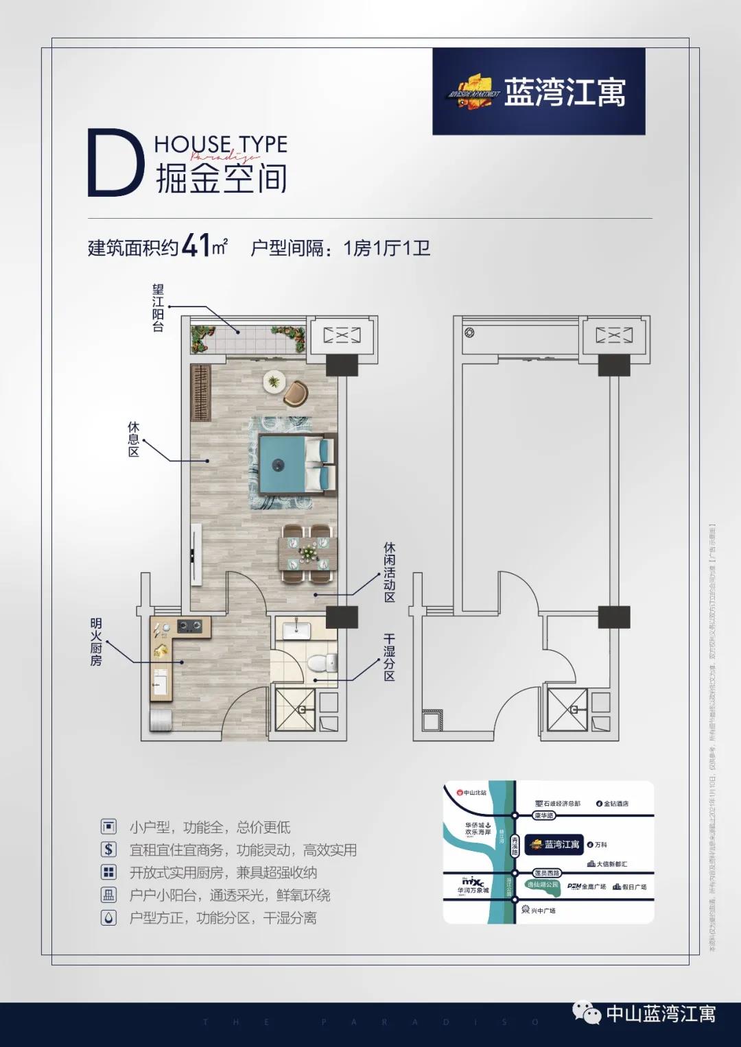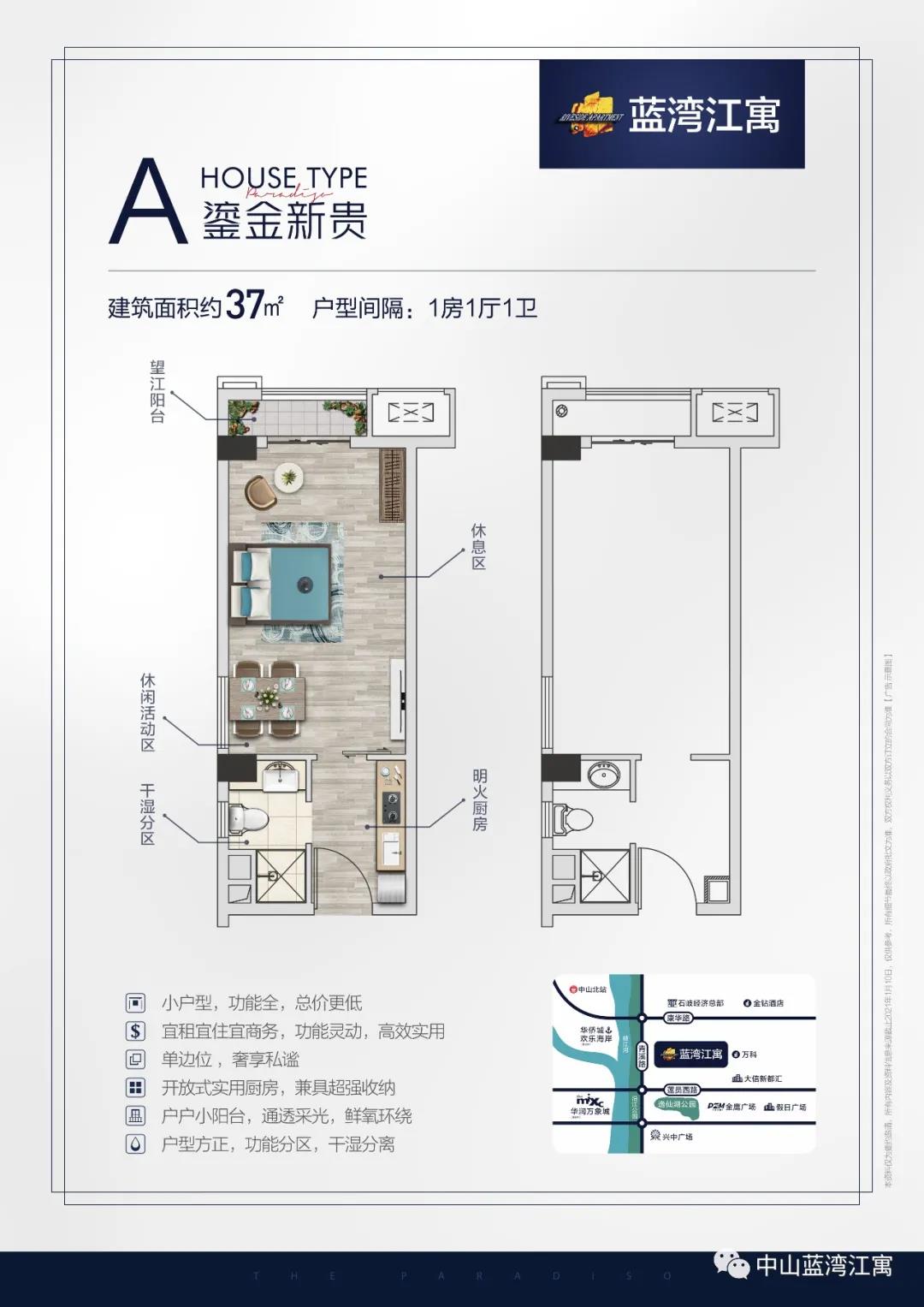 中山蓝湾江寓建面约32m2—43m2临江铂金奢寓,现楼发售,明火厨房,江景阳台,拎包即住,自由空间组合,宜居宜商宜投资,简单不失格调,精致不落俗套。
