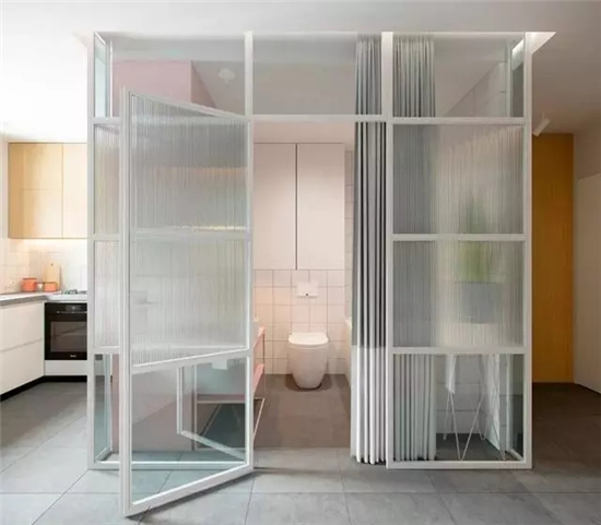 卫浴间坐落在这个空间的中央,为了减轻视觉上的重量,外墙采用了全玻璃的设计,白色边框的玻璃房极具设计感,另外,为了保护使用者的隐私在浴室内安装了窗帘。