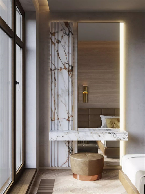 以这样的方式将卧室里的这些物品联通起来,是现下很流行的一种方式,在形式上打破原有既定的概念,彼此之间不再有泾渭分明的分隔,整体和谐又统一,抛去没有真实意义的执念,或者在视觉上满足人们的惯性感受,宽敞、明亮,这样的人性化设计,都是为了打造出一个更舒适实用耐看的生活空间。