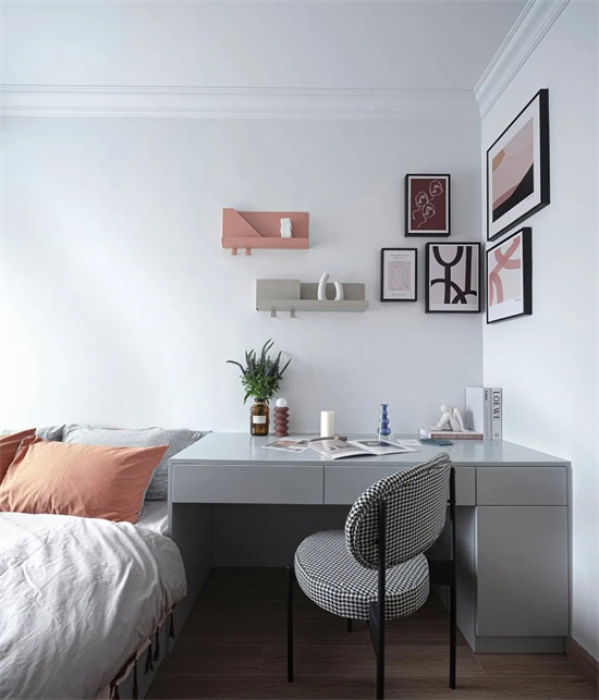 浅灰调安静而柔和,搭配饱和度低视觉感受柔和的莫兰迪色调细节软装,给人以极温柔的精神慰藉。