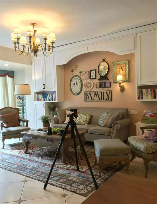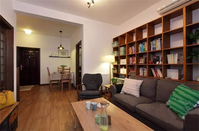 或者把背景墙给舍弃了,改成开放式的设计,沙发背后留下一条走道,再做个矮书柜当隔断,或者是做一个吧台,开放式的设计很适合小户型,更显宽敞。