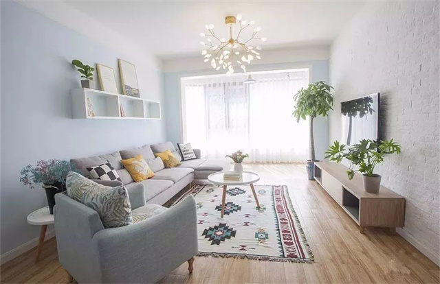 在沙发背景墙上简单装一个置物架,置物架的上方摆放了绿植和装饰画,中间还可以放一些零碎杂物、手办等。中山帮忙装修网公司分享。