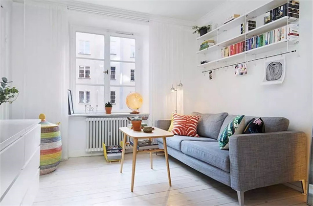 小户型的客厅空间往往不是很大,但是收纳的需求却并不会减少,除了茶几和电视柜的储物空间之外,大家把沙发背景墙也给利用起来,简单的隔板架作为沙发背景墙的收纳设计,既美观又实用,很适合小户型客厅。