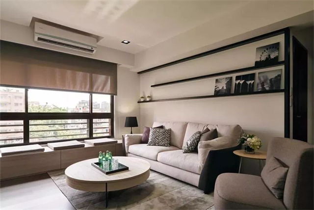 所以你可以考虑这样的做法,在顶部和四周做柜子,把沙发也嵌入柜子当中,还能留出部分的空间做背景墙,既好看又实用。