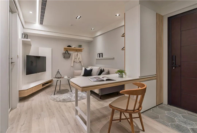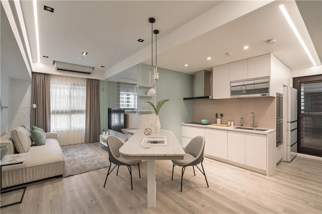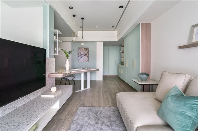 屋主自身住处的客厅暂缓了玄关与餐厨区的量体铺陈,这里是一个缓冲点,予人一刻间的留白。中山帮忙装修网公司分享。