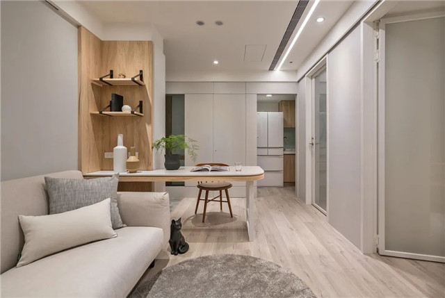 沉稳木纹桌面与净白相映,形塑一室寂静之地