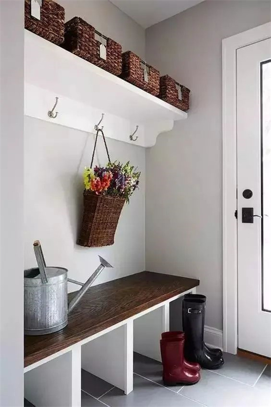 有条长走廊,就可以贴着墙面做一排鞋柜,记得在底部和中间预留部分空间,这样日常使用会更加的方便。