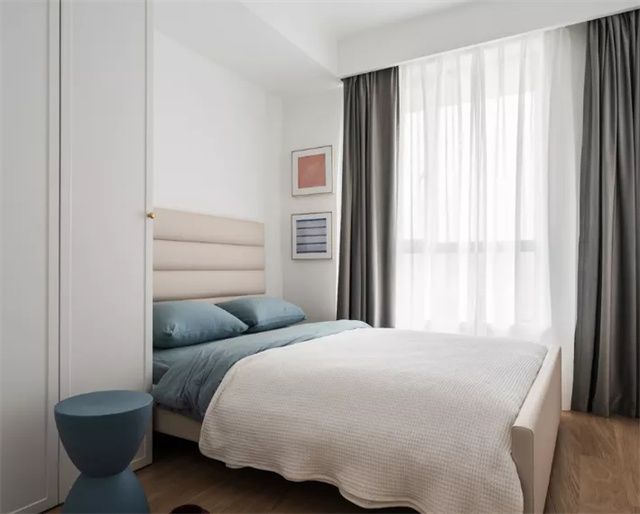次卧L形通顶柜,增加储物功能的同时不会造成空间逼仄。靠近床头设计开放格,并在其中预留插座盒开关,代替床头柜,节省空间。