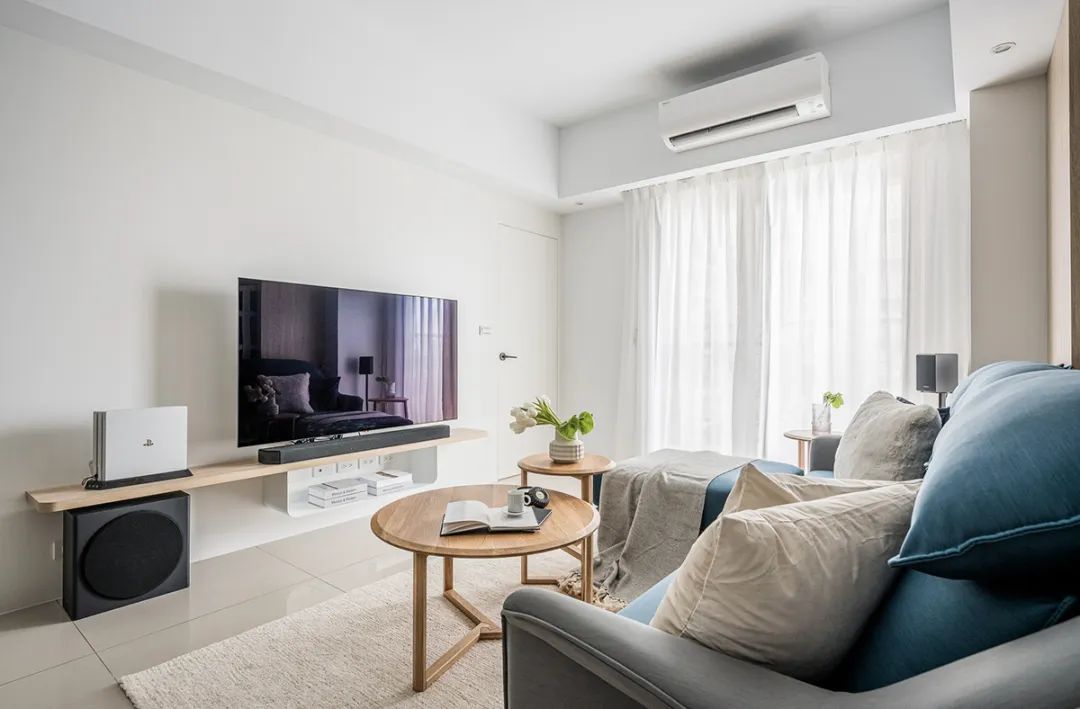 客厅简约大方,电视墙只做了一个隔板,摆放电视和相关设备。