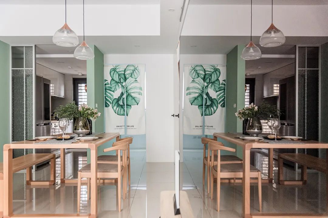 屋主夫妻热情好客,喜欢下厨,所以餐厅用一张宽敞的实木餐桌,便于招待亲友。