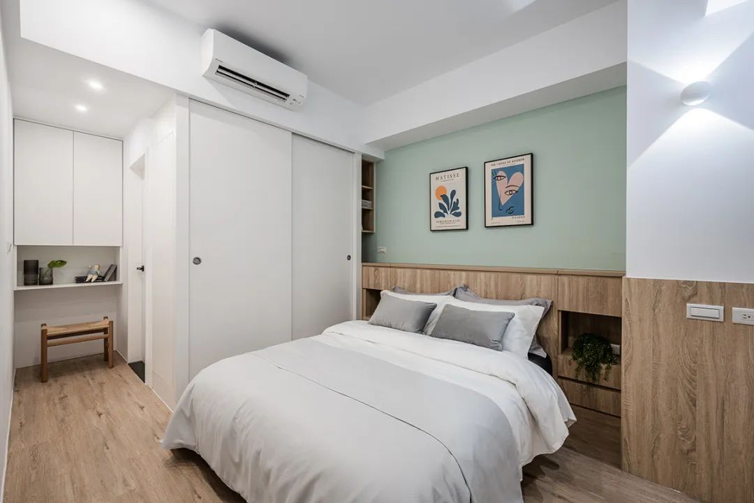 木地板上墙做半墙床头护墙板,两侧做成嵌入式的壁龛,比床头柜更节约空间。