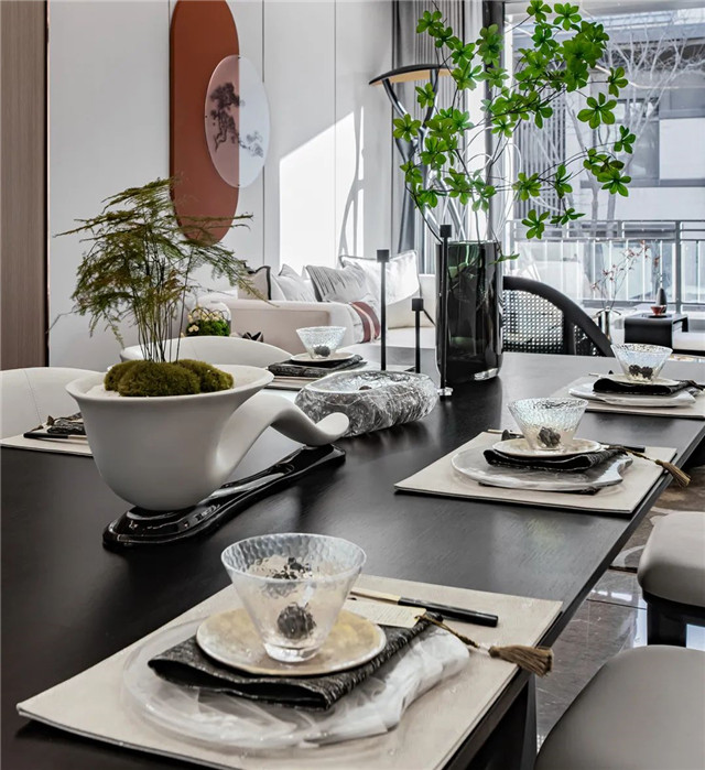别墅地上一层是起居与餐厅功能,空间大气通透。山水纹石材景墙与墨色家形成宁静致远的意境。