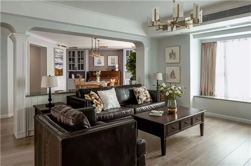 背景墙上的艺术涂料素雅别致,为空间增添了艺术气息。些微的线板点缀则呼应整体的美式味道。