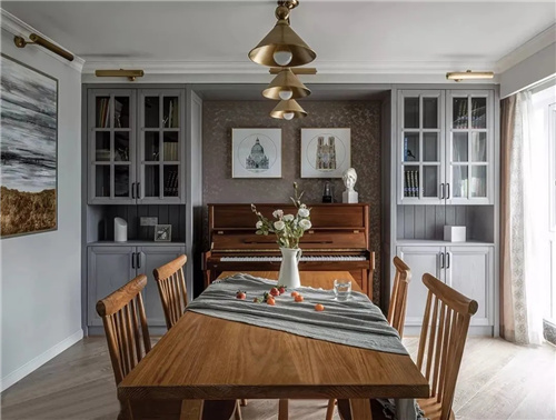 浅灰色立柜增加收纳空间的同时也为钢琴预留了摆放位子不显突兀。