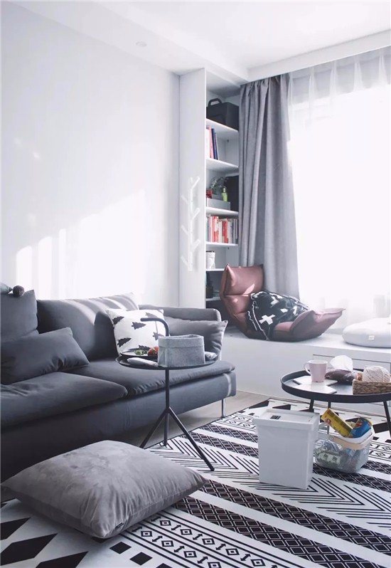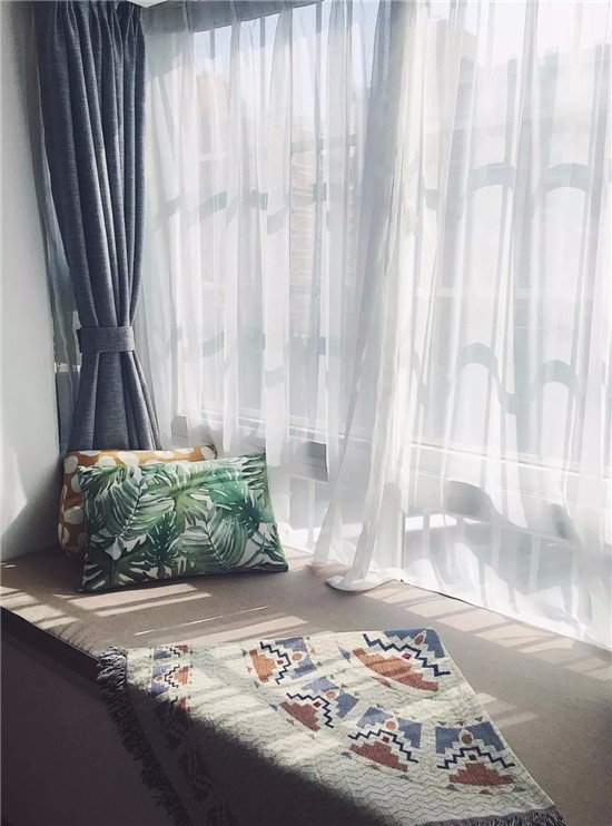 1)窗边休闲区,非常适用于没办法进行砸掉改造的飘窗。给地台定制大小一样的地垫,窗前休闲区就布置成功一半了。